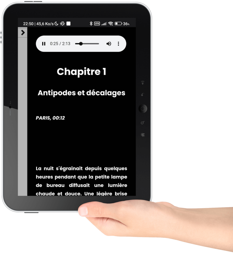 Chaque NanoBook inclut également la version audio intégrale du roman. Lecture et écoute coexistent au sein d’une même œuvre : il est possible d’écouter et de lire en même temps pour une expérience nouvelle, suivant vos l’envie, sans rupture dans l’expérience.